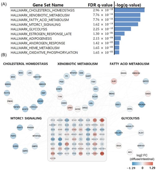 In Figure 5, we visualize networks generated by Metabolizer to observe the interactions among the entries. Cholesterol homeostasis, fatty acid metabolism, the MTORC1 pathway, glycolysis, and xenobiotic metabolism were upregulated in the intestinal subtype compared to the diffuse subtype [,,,]. Interestingly, cholesterol homeostasis, fatty acid metabolism, the MTORC1 pathway, and glycolysis are involved in lipid homeostasis [], implying that carcinogenesis of the intestinal subtype is more likely to be associated with lipid homeostasis than the diffuse subtype.