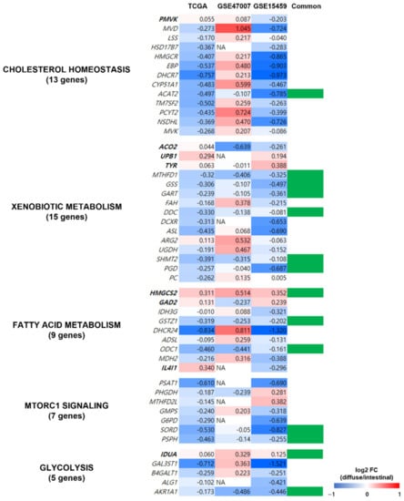 Validation of metabolism-related genes in the independent datasets of patients with GC. The expression profiles of the 49 genes of the five metabolic pathways (indicated in Figure 5B) were validated using gene expression profiles from two independent datasets of patients with GC (GSE15459 and GSE47007). Genes in bold were upregulated in diffuse compared to intestinal types in the TCGA GC dataset, and the genes in regular font were downregulated. Column “Common” indicates whether the gene showed similar gene expression profiles in all three datasets, and 14 genes (indicated in green in column Common) had similar expression profiles (diffuse versus intestinal subtypes) in TCGA and the other independent datasets.