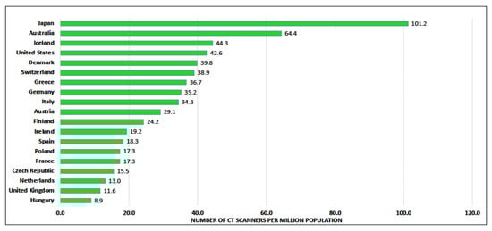 Across Europe there is a huge shortage in trained radiologists, with the UK having the lowest number of practicing radiologists at 4.7 per 100,000 of the population [42]. Radiographer numbers are also of concern. The Diagnostic Radiography Workforce UK Census 2020 showed an average vacancy rate from respondents of 10.5% [43]. There is hope that artificial intelligence (AI) solutions may help to mitigate some of these concerns, but questions remain on how and where it is best to deploy these tools in clinical practice, and further research is required to optimise their performance. These workforce challenges are not unique to radiology and will affect all diagnostic and treatment specialists. A study by Rodin at al. highlighted inequities in access to radiotherapy machines, radiation oncologists and medical physicists across Europe [44]. Access to CT scanners also varies widely between countries. Data on the number of CT scanners by country and per million of the population are presented in Figure 2 and show the wide geographical variation in availability [45]. There is a real need for investment in infrastructure, more state-of-the-art technology and attention given to workforce planning/capacity assessments on a country-by-country basis.