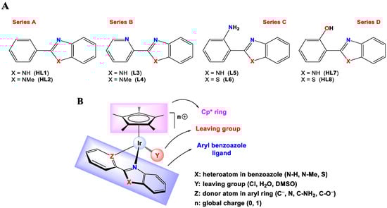 (A) Arylbenzazole ligands (L3, L4, L5 and L6) and proligands (HL1, HL2, HL7 and HL8) used in this work. (B) Schematic molecular structure of complexes studied in this work showing variable atoms.