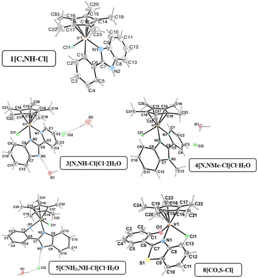 Single crystals suitable for X-ray diffraction analysis were obtained for 1[C,NH-Cl], 3[N,NH-Cl]Cl·2H2O, 4[N,NMe-Cl]·H2O, 5[CNH2,NH-Cl]·H2O and 8[CO,S-Cl] by the slow evaporation of solvents or a combination of solvents: methanol/acetone, methanol/water and methanol/dichloromethane [15,17]. The structure of 5[CNH2,NH] was reported by D. S. Pandley et al [67]. A summary of selected bond lengths and angles as well as selected geometric parameters is given in Tables S1 and S2. The crystal data collection and refinement parameters are gathered in Tables S3 and S4 in the Supporting Information.