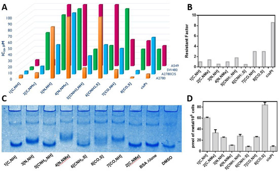 Finally, the Resistance Factor (RF) calculated as IC50,A2780CIS/IC50,A2780 (Figure 4B) reveals that complexes 7[CO,NH] and 8[CO,S] are not able to circumvent cisplatin acquired resistance on A2780cis since RF > 2 [81]. By contrast, the best performers in all the studied cell lines, complexes 1[C,NH] and 2[C,NMe], exhibited no cross-resistance.