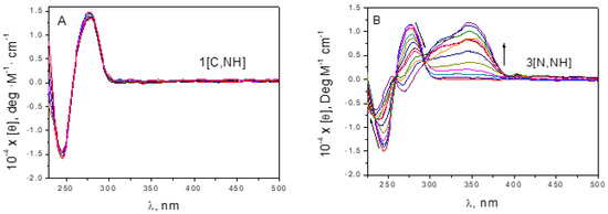 Circular dichroism spectra of DNA with (A) 1[C,NH] and (B) 3[N,NH].