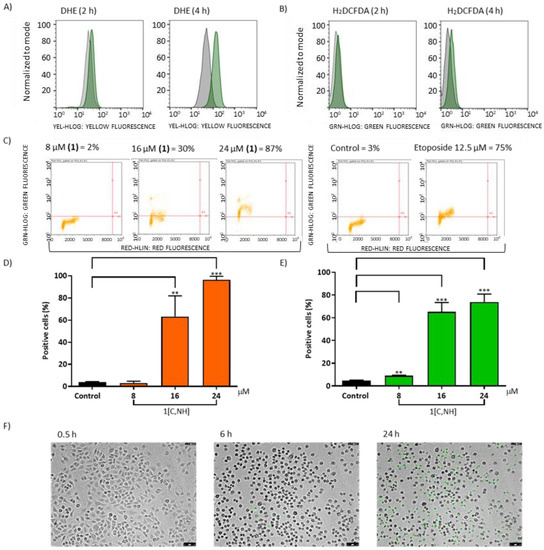 (A) O2•- production after 2 h and 4 h incubation in A549 cells with 1[C,NH] and detection using DHE by flow cytometry. (B) ROS production (H2O2 included) after 2 h and 4 h incubation in A549 cells with 16 µM of 1[C,NH] and detection using H2DCFDA by flow cytometry. Green profile = 1[C,NH], Gray profile = Vehicle. 5000 stained cells were analyzed using the Guava EasyCyte flow cytometer and processed with the FlowJo program. Increases in fluorescence are indicative of increased ROS production. Images were representative of at least three independent experiments. (C) Percentage of A549 positive cells to damage on DNA analyzed by flow cytometry. Cells were treated for 4 h at the indicated doses of 1[C,NH] (left). Untreated cells (control) and treated cells with Etoposide (positive control). (D) Cardiolipin oxidation. Percentage of positive cells. A549 cells were analyzed by flow cytometry after 4h incubation at the indicated concentrations of 1[C,NH]. Data shown are the mean and SD of at least three independent experiments (** p < 0.01), *** p < 0.001; (E) Release Cytochrome c. Percentage of positive cells were measured using Millipore’s FlowCellect Cytochrome C Kit. A549 cells were incubated for 5 h at the indicated concentrations of 1[C,NH] and analyzed by Flow Cytometry. Data shown are the mean and SD of at least three independent experiments (** p < 0.01, *** p < 0.001). (F) Caspase activity was determined using CellEvent Caspase 3/7 Green Detection Reagent. A549 cells were treated with 16 µM of 1[C,NH] and observed using fluorescence microscope for 24 h. Images were captured at indicated incubation time. Green fluorescence emission indicates caspase activity (caspases 3/7). Magnification (10×).