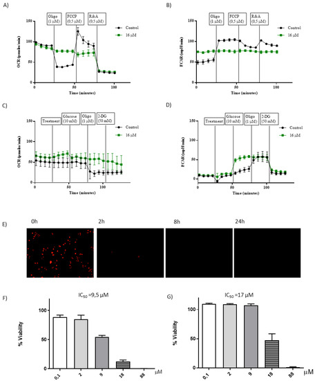 OCR (A) and ECAR (B) profile of A549 cells, incubated for 1 h with 1[C,NH] (16 µM) or vehicle (control). (C) OCR and (D) ECAR profile of A549-gal incubated with (treatment) 1[C,NH] (16 μM) or vehicle (control). Seahorse images are representative of three independent experiments. (E) A549 cells were pre-stained with TMRM (50 nM) and treated with 16 µM of 1[C,NH]. Images (10×) were obtained at indicated incubation times after the treatment. Percentage of viability of A549 proliferant cells (F) and A549 quiescent cells (G), after 24 h of incubation at different concentrations of 1[C,NH]. Data shown are the mean and SD of at least three independent experiments.