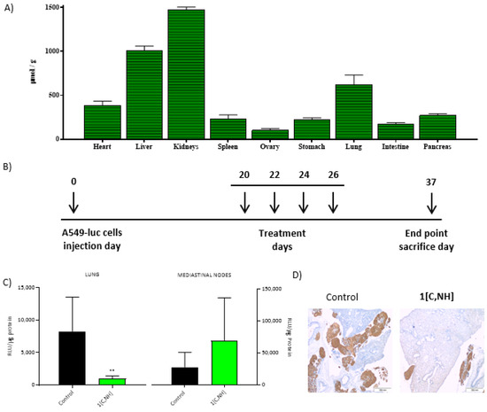 (A) Iridium biodistribution in extracted organs 4 h after i.v. injection of 1[C,NH]. (B) In vivo monitoring scheme. (C) Luciferase activity quantification measured in protein extracts of lung or mediastinal nodes, ** p < 0.01. (D) Immunohistochemical staining of mouse lungs using anti-CK7 antibody. Left: control group. Right: Treated group. Brown stain shows tumor cells.