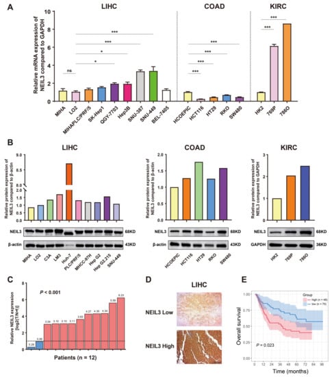 Experimental validation of the expression and prognosis of NEIL3 in cancers. (A) mRNA expression of NEIL3 in LIHC, COAD, and KIRC cell lines. (B) Protein expression of NEIL3 in LIHC, COAD, and KIRC cell lines, as well as their quantitative results. (C) mRNA expression of NEIL3 in 12 patients’ LIHC and paired adjacent liver tissues. (D) Representative images of IHC staining of HCC patient samples with low and high NEIL3 expression. (E) Difference in OS between high and low NEIL3 expression groups. ns indicates no significance, * p < 0.05, *** p < 0.001.