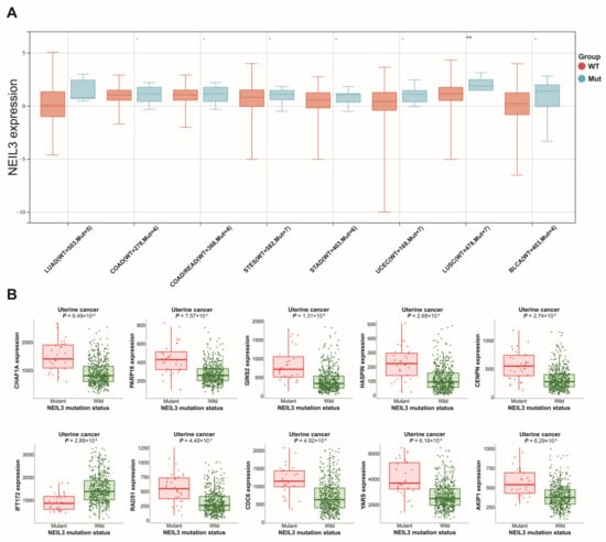 Prediction of NEIL3 expression and affected genes related to NEIL3 mutation. (A) The expression of NEIL3 between NEIL3 mutation and non-mutation groups. (B) Expression of the genes affected by NEIL3 mutation. ** p < 0.01.