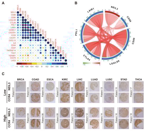 Our analysis showed that NEIL3 expression was negatively correlated with Th1 and Th17 cells and plasmacytoid DCs (pDCs), which are immunocytes that indicate a good prognosis in cancers [34,35,36]. In contrast, NEIL3 expression was significantly associated with active CD4 T cells and Th2 cells, which implies cancer recurrence in most tumors [37] (Figure S13F). CCR4 is a biomarker expressed at the surface of Th2 cells [38]. Our IHC staining of CCR4 and NEIL3 in multi-organ tumor arrays suggested that NEIL3 is positively associated with the expression of CCR4 in BRCA, COAD, ESCA, KIRC, LIHC, LUAD, LUSC, STAD, and THCA samples (Figure 7C).