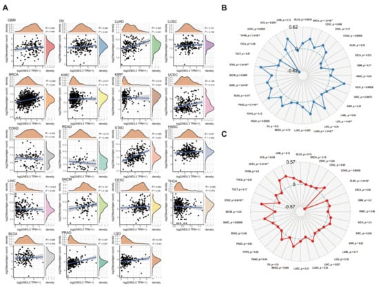 Changes in DNA methylation are considered promising targets for cancer diagnosis and prognosis [45]. The correlation between the expression level of NEIL3 and four DNA methyltransferase genes was explored. Remarkably, NEIL3 expression was positively correlated with all or part of the expression levels of these four DNA methyltransferase genes in pan-cancer, except for CHOL (Figure 9B).