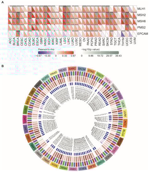 NEIL3 expression is correlated with MMR and DNA methyltransferase genes in multiple cancers. Correlation between NEIL3 expression level and (A) mutation of five MMR genes, namely, MLH1, MSH2, MSH6, PMS2, and EPCAM; (B) expression of four DNA methyltransferase genes, namely, DNMT1 (red), DNMT2 (blue), DNMT3A (green), and DNMT3B (purple), in various cancers. The innermost brown and blue circles represent the R and p values of the correlation analysis, respectively. * p < 0.05, ** p < 0.01, *** p < 0.001.