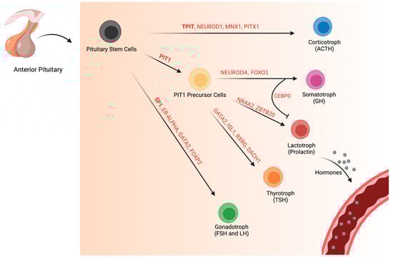 34. Dasen, J.S.; O’Connell, S.M.; Flynn, S.E.; Treier, M.; Gleiberman, A.S.; Szeto, D.P.; Hooshmand, F.; Aggarwal, A.K.; Rosenfeld, M.G. Reciprocal Interactions of Pit1 and GATA2 Mediate Signaling Gradient–Induced Determination of Pituitary Cell Types. Cell 1999, 97, 587–598. [Google Scholar] [CrossRef] [PubMed]