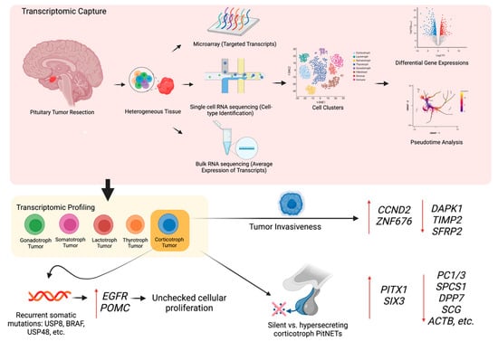 Figure 2. Transcriptomic profiling of pituitary neuroendocrine tumors. (TOP) A transcriptome captures a snapshot in time of diverse transcripts present in a pituitary tumor cell. Microarrays capture a set of predetermined sequences whereas single-cell RNA sequencing and bulk RNA sequencing capture all transcripts using high-throughput sequencing. In contrast to bulk RNA sequencing, single-cell RNA sequencing can identify and analyze cell subpopulations. (BOTTOM) Transcriptomic analysis reveals differentially expressed genes that drive various tumor behaviors, such as hormone hypersecretion and tumor invasiveness. Transcriptomic changes in a corticotroph tumor cell are highlighted in this diagram.
