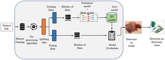Although deep learning is superior to hand-crafted feature representation, large annotated datasets are required, which professional oncologists lack the time to create. Thus, many studies [28,29,30,31,32,33] used transfer learning for skin disease classification to extract useful information from a previous dataset and apply it to a “raw target domain”; this obviates the need for expensive annotation of target data. Kessem et al. [30] used a pre-trained model and the GoogLeNet architecture to perform transfer learning using an ISIC 2019 dataset and successfully classified 8 classes of skin lesions using the Inception model; the accuracy was 94.2%. Hosny et al. used an AlexNet pre-trained model and the MED-NODE dataset for automated skin lesion classification. The model had a dropout layer and used the SoftMax activation function. An ImageNet dataset has been used to create pretrained, fine-tuned models, including MobileNet, InceptionV3, Resnet50, EfficientNet, and MobilenetV2. In [34], the accuracy of these models for skin cancer classification was 84%. Hari et al. [35] enhanced accuracy and precision to 90% and 89%, respectively, using the ResNet50 architecture. Even though deep learning models give the best results in cancer detection, less focus has been given to embedded-based systems. We train and test precise models on the Raspberry Pi platform with limited computation power.