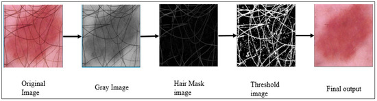 The removal of hair artifacts, which are common in dermatoscopic images, is essential and can be achieved using various complex segmentation techniques [27,37,38]. Our algorithm removes noise but not crucial information. The images are converted into grayscale and then subjected to thresholding using a black-hat filter. The hair mask contour yields a threshold image. OpenCV contains an “inpaint” function that restores a selected region in an image by reference to the neighboring area. We apply this function in the last stage to obtain uniform images with minimal information loss. Figure 4 shows the outputs of each process.