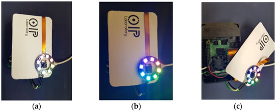 The experiment was performed using an Intel Core i5-7500 3.40GHz processor running Windows 10 (32 GB of RAM, NVIDIA GeForce GTX 10050Ti graphical processor). The IoT device was a Raspberry Pi 4 microprocessor with a 64-Gb SD card. A spy camera and NeoPixel ring were attached to the camera port and main board. The ring ensures that photographs/videos taken at any time (day or night) are clear. The ring GND, 5V, and D1 pins were connected to pins 1, 6, and 12 of the Raspberry Pi, respectively. The device dimensions are 9 × 6.3 × 3.5 cm3. Figure 6 provides images of the device.