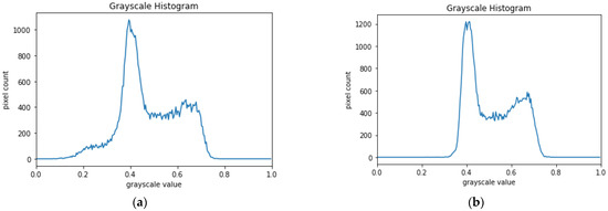 Histograms (pixel intensity vs. frequency) obtained from the image (a) before and (b) after digital hair removal.