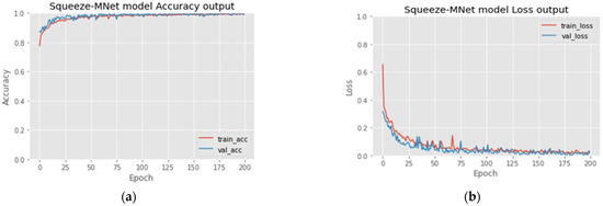 Table 1 compares our model to other pretrained models used for transfer learning. For training, there were 50 epochs and a batch size of 16 in all cases. An IoT model must be very accurate, but small in size; Table 1 shows Squeeze-MNet was optimal in terms of accuracy, training time, and the AUROC. The training time factor affects the speed of the detection; when training time and total extracted features are higher, the model is heavy (that is, needs huge memory to run the model), e.g., VGG-16 and Xception. When extracted features or training time is lower, the model gives less accuracy, such as with MobilenetV3Small mode. The proposed model gives the best tradeoff of size and accuracy. Figure 8 shows that the true-positive rate increased over time. ROC curve (Appendix A, Point 1) construction is necessary to evaluate an unbalanced dataset. The red line in Figure 8a shows the behavior of the untrained model, and the blue line denotes the accuracy after learning. The AUC-ROC measures model performance and ranges from 0 to 1. An ideal model has an AURC-ROC of 1; that of our model was 0.989. In Figure 8a, the red line is the performance of the model without knowledge, and the blue line is the intelligence gained with each epoch. This is about gaining logic; hence, we named it a logistic skill. AUC is equivalent to the probability that a randomly chosen positive instance is ranked higher than a randomly chosen negative instance. The overall error rate (1-accuracy) is 0.64, which is a combination of false positive and false negative. Both values are mentioned in the confusion matrix in Figure 8b. Our system does not perform well with false positive values. In the medical field, false positive is stressful, and false negative is fatal to patients. AI experts and researchers need to fix this issue.