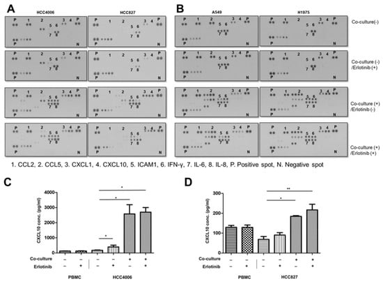 Cytokine array analysis of coculture supernatants during EGFR-TKI treatment. EGFR-mutant, EGFR-TKI (erlotinib)-sensitive cell lines (HCC 4006 and HCC827), EGFR wild-type, EGFR-TKI resistant cell line (A549), and EGFR-mutant, EGFR-TKI (erlotinib)-resistant cell line (H1975) indirectly cocultured with activated PBMC with or without erlotinib (10 nM for HCC827 and 40 nM for HCC4006, H1975, and A549) for 48 h. (A,B) CXCL10 (dot #4) was elevated after coculture, whereas erlotinib treatment had no effect on CXCL10 expression levels in HCC4006, HCC827, and H1975 cells. Spot densities from each membrane are described in Supplementary Table S1. (C,D) ELISA analysis of supernatants cocultured with activated PBMCs and two EGFR-mutant, EGFR-TKI-sensitive cell lines (HCC4006 and HCC827, respectively) during erlotinib treatment©. Data are presented as mean ± SD of three independent experiments. Statistical significance was determined with an unpaired Student’s t-test (* p < 0.05, ** p < 0.01 versus cultured HCC4006 cells or HCC827 cells alone, respectively).