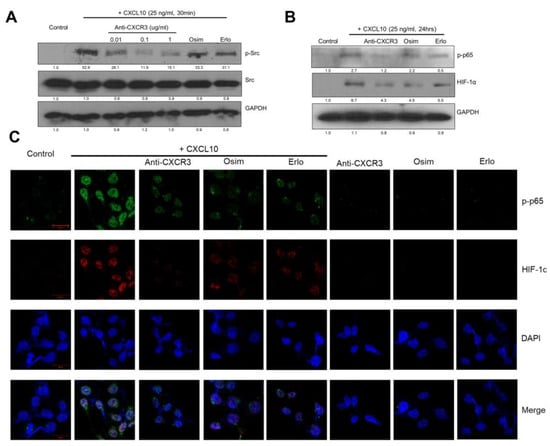 Cultured cells were harvested from plates and lysed on ice for 30 min with a RIPA buffer containing 1× protease/phosphatase inhibitors. After protein extraction, samples were quantified with a Pierce™ BCA Protein Assay kit (Thermo Scientific, Rockford, IL, USA). Protein (20 μg) was separated on a discontinuous PAGE gel, then transferred to a nitrocellulose membrane at 70 V for 2 h. Membranes were incubated at 4 °C overnight with the indicated dilutions antibodies to the following proteins: p-STAT3 (1:400, Cell Signaling Technology, Danvers, MA, USA), STAT3 (1:400, Santa Cruz Biotechnology), p-p65 (1:400 dilution, Santa Cruz Biotechnology, Dallas, TX, USA), HIF-1α (1:400, Santa Cruz Biotechnology), CXCR3 (1:1000, BioLegend, San Diego, CA, USA), p-Src (Tyr416, 1:1000, Cell Signaling Technology, Danvers, MA, USA), Src (1:1000, Cell Signaling Technology, Danvers, MA, USA), and GAPDH (1:2000, Santa Cruz Biotechnology, Dallas, TX, USA). Protein bands were detected with an ECL Kit (Cytiva, Marlborough, MA, USA) and developed on light-sensitive film.