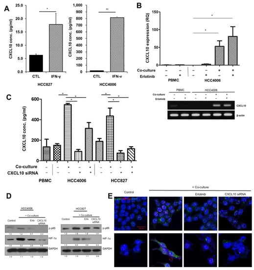 Autocrine activation of the CXL10/CXCR3 pathway by endogenous CXCL10 in EGFR-mutant lung cancer cells. (A) Supernatants collected from HCC4006 and HCC827 cells treated with 20 pg/mL IFN-γ for 72 h were analyzed using ELISA for CXCL10 (* p < 0.5 and ** p < 0.01 versus control). (B) Increased CXCL10 mRNA expression of HCC 4006 with coculture and treatment of EGFR-TKI. (C–E) HCC4006 and HCC 827 cells cocultured with activated PBMCs for 48 h and treated for 6 h with siRNA against endogenous CXCL10. (C) ELISA quantification for CXCL10 of supernatants from coculture with activated PBMC (* p < 0.05). (D) Western blot analysis of samples treated with siRNA against CXCL10. € Immunofluorescence analysis of p-p65 and HIF-1α in cells treated with siRNA CXCL10 or erlotinib (50 nM, HCC4006 cell and 20 nM HCC827 cells). Nuclei were counterstained with DAPI (blue) for the detection of DNA. Data are presented as mean ± SD of three independent experiments. Cells were treated with 100 µM of each of the STAT3 and HIF-1α inhibitors.