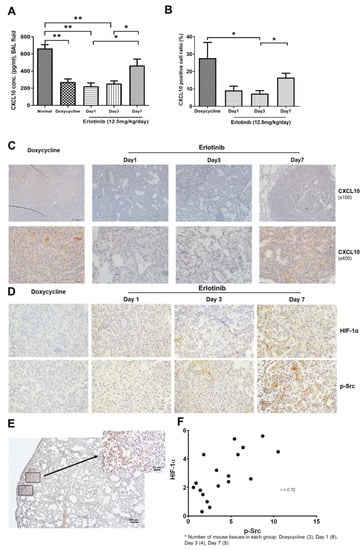 Compared with the level of CXCL10 in BAL fluid, the expression of CXLC10 by persistent tumor cells was significantly decreased immediately after 1 day of erlotinib treatment, but it gradually increased with erlotinib treatment (Figure 5B,C). The expression of p-Src and HIF-1α in persistent tumor cells increased and was dependent on EGFR-TKI treatment (Figure 5D,E). Moreover, the expression levels of p-Src and HIF-1α were significantly correlated (Pearson’s analysis: r = 0.72, p = 0.0018; Figure 4F). The expression of CXCL10 was detected in the macrophage of lung tumor. Erlotinib treatment resulted in no significant change (Supplementary Figure S2).