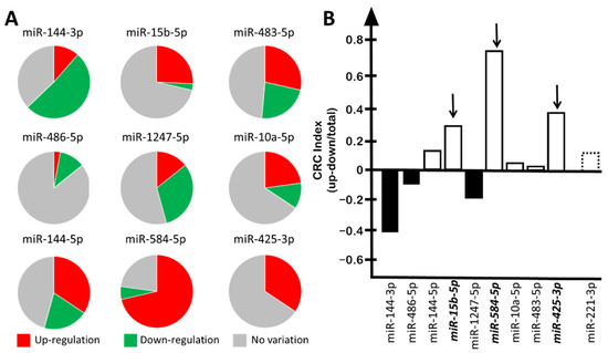Content of the miRNAs belonging to the “9-miRNA signature” in the plasma from CRC patients. (A) Pie chart reporting the number of CRC patients in which each indicated miRNA was found up-regulated (red), down-regulated (green), or to have no substantial variation detected (gray). (B) Summary of the “CRC-index” values of the “9-miRNA signature” compared to miR-221-3p. “CRC-index”: (number of patients displaying up-regulation–number of patients displaying down-regulation)/total number of patients analyzed. Up-regulated miRNAs are reported as white boxes, and down-regulated miRNAs as black boxes. Dotted box: miR-221-3p.