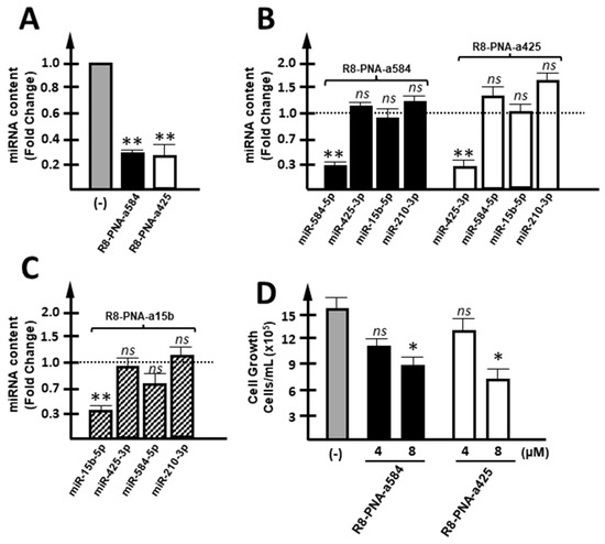 Effects of R8-PNA-a425 and R8-PNA-a584 on miRNA content. (A) Effects of anti-miRNA PNAs on their respective target miRNA, after performing 72 h of culturing of HT-29 cells. (B) Possible off-target effects were verified for both R8-PNA-a584 (white boxes) and R8-PNA-a425 (black boxes): miR-425-3p, miR-15b-5p, and miR-210-3p content was calculated for R8-PNA-a584-treated HT-29 cells, while miR-584-5p, miR-15b-5p, and miR-210-3p were quantified when R8-PNA-a425 was employed. (C) Specificity of R8-PNA-a15 was confirmed by quantifying miR-15b-5p, miR-425-3p, miR-584-5p, and miR-210-3p content in HT-29 R8-PNA-a15b-treated cells. (D) Effects on HT-29 cell growth of 4 and 8 µM R8-PNA-a584 (black boxes), R8-PNA-a425 (white boxes). (* p < 0.05, ** p < 0.01, ns: not significant, n = 3 independent experiments).