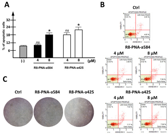Effects of R8-PNA-a425 and R8-PNA-a584 on apoptosis. (A) Effects of anti-miRNA PNAs on apoptosis induction in HT-29 cells treated for 72 h with 4 or 8 µM R8-PNA-a584 (black boxes) or R8-PNA-a425 (white boxes). (B) Representative plots of the apoptotic profile are reported. (C) Representative pictures showing the morphological appearance of HT-29-treated cells are reported. (* p < 0.05, ns: not significant; n = 3 independent experiments).