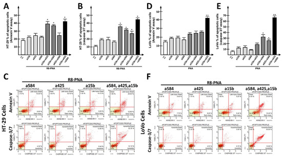 To this aim, HT-29 (Figure 4A–C) and LoVo (Figure 4D–F) cells were cultured for 72 h in the presence of (a) suboptimal concentrations (4 µM) of singularly administrated anti-miRNA PNAs, or (b) a combination of 2 or 3 PNAs. The effects of single PNAs or PNA combinations on target miRNAs and on other unrelated miRNAs were verified (Supplementary Figure S6), confirming the target specificity of the employed PNAs. Simultaneous miRNA targeting using two-PNA combinations led to additive (R8-PNA-a584 plus R8-PNA-a425) or synergistic (R8-PNA-a584 plus R8-PNA-a15b; R8-PNA-a425 plus R8-PNA-a15b) effects when suboptimal concentrations of PNAs were employed. This was found using either the Annexin V (Figure 4A,D) or the Caspase 3/7 (Figure 4B,E) assays. Interestingly, the triple combination of R8-PNA-a584, R8-PNA-a425, and R8-PNA-a15b led to the maximum level of apoptosis as assessed by Annexin V and Caspase 3/7 assay. Representative key apoptotic profiles are reported in Figure 4C,F. A complete set of representative apoptotic profiles can be found in the Supplementary Materials (Supplementary Figure S7). Remarkably, a control unrelated scrambled PNA used at a concentration of 12 μM (corresponding to the sum of the three investigated PNAs used at 4 μM when singularly administered) was found to have very low effects on apoptosis induction (Figure S5). In fact, the increase in the apoptotic rate with respect to the control samples was found to be lower than 10% and 5% in the Annexin V and Caspase 3/7 assays, respectively.