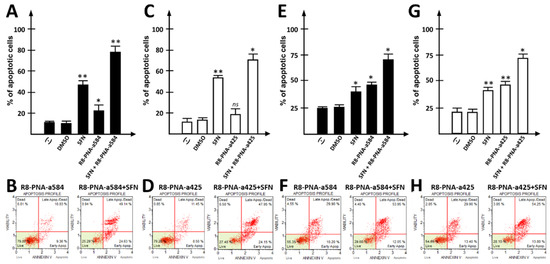 When singular treatments were compared with combined treatments using R8-PNA-a584, R8-PNA-a425, and SFN, the rate of apoptosis induction obtained using the combined approach was significantly higher. The employed concentrations of PNAs and SFN were based on previously reported observations by our and other groups [35,66,67]. The treatments were carried out for 72 h. Figure 5 reports the data obtained by combining SFN with R8-PNA-a584 (Figure 5A,B,E,F) and R8-PNA-a425 (Figure 5C,D,G,H). In both cases, high rates of apoptotic cells (over 75%) were obtained, when the Annexin V assay was performed. The means of three independent experiments are reported in Figure 5A,C,E,G, while representative plots are presented in Figure 5B,D,F,H. Synergistic effects of the combined treatments (SFN + R8-PNA-a425; SFN + R8-PNA-a584) were confirmed after analyzing the data considering the increase in the proportion of apoptotic cells with respect to control untreated (or DMSO-treated) cells. Representative raw data can be found in the Supplementary Materials (Supplementary Figure S9). No synergic effects were observed when SFN was added to an unrelated sequence PNA (Supplementary Figure S10).