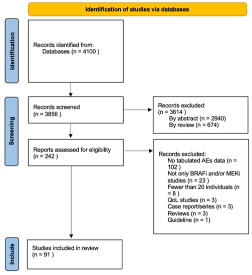 The selection of the studies was conducted based on the following inclusion criteria: (a) studies on BRAF inhibitors and MEK inhibitors, (b) studies with a sample size of 20 patients or higher, and (c) studies reporting data on toxicity related to BRAF and MEK inhibitors. Reviews, case reports, and studies on the evaluation of QoL (quality of life) were excluded. The retrieved articles were screened and selected by two independent authors (M.B. and L.P.) according to the inclusion and exclusion criteria, and disagreements were settled by a third researcher (M.G.). This process resulted in 91 eligible records (Table S1) [9,14,16,21,22,23,25,26,27,28,29,30,31,32,33,34,35,36,37,38,39,40,41,42,43,44,45,46,47,48,49,50,51,52,53,54,55,56,57,58,59,60,61,62,63,64,65,66,67,68,69,70,71,72,73,74,75,76,77,78,79,80,81,82,83,84,85,86,87,88,89,90,91,92,93,94,95,96,97,98,99,100,101,102,103,104,105,106,107,108,109]. Among them, 68 are about melanoma and 23 are about other cancers. Line of therapy was not a selection criterion.