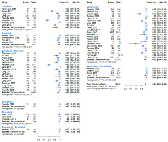 Adverse events of any grade (G1–G5) have been registered in a large percentage of patients treated with BRAF and MEK inhibitors (Figure 2). Among BRAF inhibitors, Vemurafenib induced adverse events of any grade in 93% of patients (95% CI: 90–95%), Dabrafenib in 85% (95% CI: 72–93%), whilst patients who underwent treatment with Encorafenib developed a toxicity of any grade in 99% of cases (95% CI: 97–100%) (Table 1). Regarding MEK inhibitors, 97% of patients who underwent treatment with Trametinib (95% CI: 92–99%) and Binimetinib (95% CI: 94–99%) developed a toxicity of any grade (Table 1). As for the combined therapies, Vemurafenib plus Cobimetinib induced side effects of any grade in 98% of patients (95% CI: 96–99%) (Table 1). This kind of toxicity was reported in 94% of patients who, instead, underwent treatment with an association of Dabrafenib and Trametinib (95% CI: 89–97%) and in 98% of patients who underwent treatment with an association of Encorafenib plus Binimetinib (95% CI: 96–100%) (Table 1). Significant heterogeneity (p < 0.05) emerged for all considered treatments.