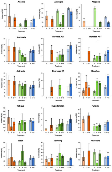To obtain this and achieve accurate results with a complete and clear profile of side effect incidence rates, the analysis has been divided into four different fields: two of which focus on any-grade and grade 3 through 5 side effects, and two other fields concentrating specifically on single side effects belonging to both previously mentioned categories. The side effects we chose to analyze singularly are the ones deemed both common and clinically relevant, and they include: anemia, arthralgia, alopecia, asthenia, diarrhea, fatigue, pyrexia, rash, vomiting, headache, transaminase level increases, anorexia, hypertension, and decreased ejection fraction.