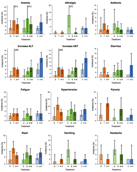 Summary estimates of incidence (%) and corresponding 95% confidence interval of grade 1–2 adverse events according to treatment. ALT: alanine aminotransferase; AST: aspartate aminotransferase; C: Cobimetinib; D: Dabrafenib; E: Encorafenib; EF: ejection fraction; T: Trametinib; V: Vemurafenib.