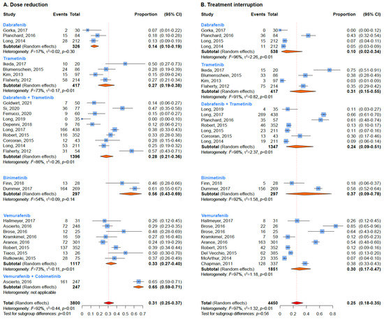 Summary estimates of dose reduction (A) and treatment interruption (B) according to treatment regimen.