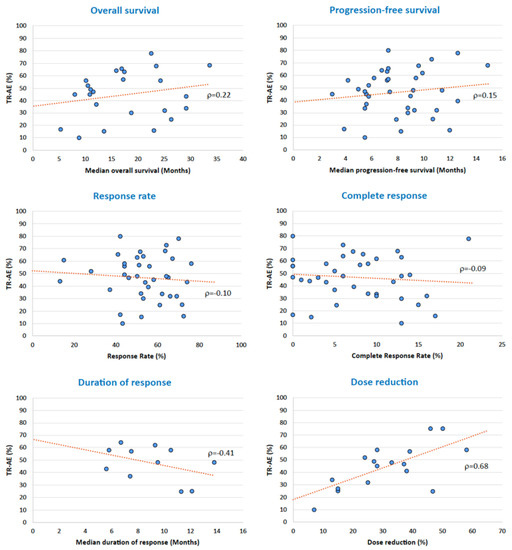 To evaluate whether side effects have an impact on prognosis, we correlated the reported incidence of side effects and some oncological outcomes. No correlation emerged between the incidence of side effects and the median progression-free survival (r = 0.15), response rate (r = −0.10), and complete response rate (r = −0.09). There was a slight positive correlation, instead, between the incidence of side effects and the median overall survival (r = 0.22). A slight but negative correlation was instead registered between the incidence of side effects and the median duration of response (r = −0.41). Finally, there was a strong, direct, positive correlation between the incidence of side effects and dose reduction (r = 0.68) (Figure 7).
