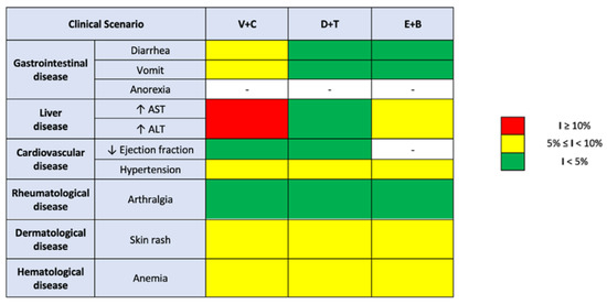 Although the combination of Vemurafenib and Cobimetinib is associated with higher incidence rates of diarrhea compared to other doublets, the same result does not emerge when considering vomiting and anorexia. In fact, although the results are clear in stating that the use of Dabrafenib and Trametinib is associated with a higher incidence rate of anorexia, the same cannot be stated for vomiting, where the data are conflicting. A higher incidence rate of grade 1–2 vomiting is related to the use of Encorafenib and Binimetinib, whilst when it comes to grades 3 or higher toxicity, the V-C doublet emerges. Comparing the results obtained on the incidence profiles of the single most frequent side effects following the prescription of BRAF and MEK inhibitors, it is observed that the combination therapy with Vemurafenib and Cobimetinib is associated with a higher rate of diarrhea, arthralgia, and skin rash for any considered grade. This combination is also correlated to an onset of liver toxicity with a transaminase level increase, and cardiovascular toxicity, resulting in higher incidence rates of hypertension and decreased ejection fraction when compared to the other doublets, even though, focusing especially on the grade 3 or higher decrease in ejection fraction, higher incidence rates were reported in the Dabrafenib and Trametinib therapy regimen.