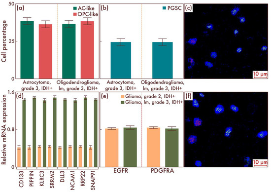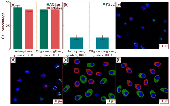 Within the sample cohort, we first assessed the content of different cell populations in astrocytomas, IDH-mut, grade 2, and in oligodendrogliomas, IDH-mut, grade 2, by flow cytometry. The results obtained, in general, corresponded to the results of earlier studies, according to which there were no significant differences at the cell-population level between the two considered nosological units (p = 0.842, Figure 1a). The main cell mass consisted of AC-like and OPC-like cell populations in approximately equal proportions; PGSCs acted as the cambial pool (Figure 1b). The obtained data were confirmed by mrFISH and immunofluorescence on the patient material (Figure 1c–f).