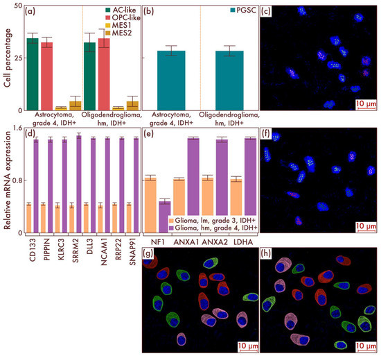 Cell-population composition in astrocytomas, IDH-mutant, grade 4, and in oligodendrogliomas, IDH-mutant, grade 3, with a relatively high malignancy (hm). (a) Ratio of the quantitative content of astrocyte-like cells (AC-likes), oligodendrocyte-progenitor-like cells (OPC-like) populations, and mesenchymal-like cell population (MES-like) with MES1 and MES2 subpopulations in percentage of the total number of tumor cells. (b) Quantitative content of proneuronal glioma stem cells (PGSCs) as a percentage of the total number of tumor cells. Astrocytomas, IDH-mutant, grade 4, and oligodendrogliomas, IDH-mutant, grade 3, hm, were also compared by PCR with astrocytomas, IDH-mut, grade 3 (c), and oligodendrogliomas, IDH-mutant, grade 3, lm, in relation to gene expression activity of mesenchymal definitive cell populations (e) and stem cells (d). The results were confirmed on astrocytomas, IDH-mutant, grade 4 (c), and on oligodendrogliomas, IDH-mutant, grade 3, hm (f), by multiparametric fluorescence in situ hybridization and immunofluorescence (g,h), on which the red marks correspond to EGFR, green marks to PDGFRA, pink marks to DDIT3, and lime marks to CD133.
