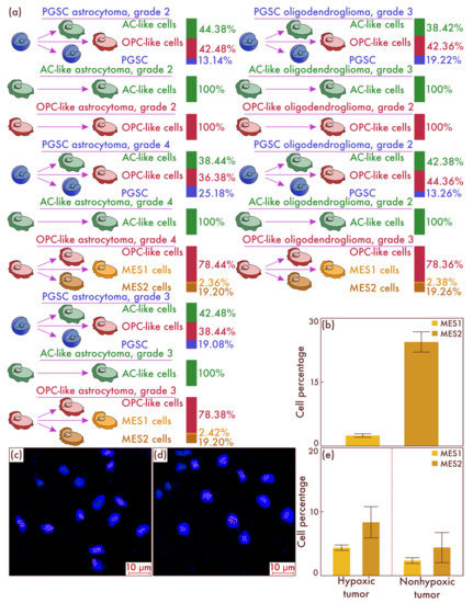 Tracing the cell fate of different tumor cells’ populations isolated in the tissue of astrocytomas and oligodendrogliomas of different grades placed in hypoxic conditions (a). Histogenetic transformation pathways of astrocyte-like cells (AC-likes), oligodendrocyte-progenitor-like cells (OPC-likes), and proneuronal glioma stem cells (PGSCs) are presented. The quantitative ratio of mesenchymal-like cell population MES1 and MES2 in the cell culture formed as a result of seeding PGSC from astrocytomas, IDH-mut, grade 3 and grade 4, and from oligodendroglioma, IDH-mut, grade 3, as a percentage of the total cell mass is also shown (b). The results were confirmed in cultures of astrocytomas, IDH-mutant, grade 4 (c), and in oligodendrogliomas, IDH-mutant, grade 3 (d), by multiparametric fluorescence in situ hybridization, on which green marks correspond to PDGFRA, and pink marks correspond to DDIT3. The results of a comparative study (e) of the mesenchymal-cell-population composition of glioblastomas both with and without the HIF-1α hypoxia marker increase are presented in the material of patients’ neoplasms.