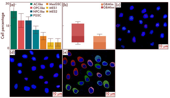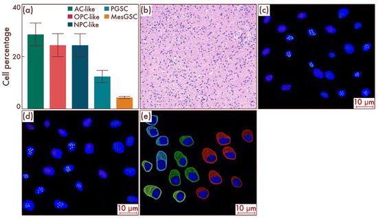 Cell-population profiling in glioblastomas, grade 4, without classical pathohistological criteria in the form of necrosis and vascular proliferation (a). (b) Ratio of the quantitative content of astrocyte-like cells (AC-likes), oligodendrocyte-progenitor-like cells (OPC-likes), neural progenitor-like cell (NPC-like) populations, proneuronal glioma stem cells (PGSCs), and mesenchymal glioma stem cells (MesGSCs) as a percentage of the total tumor cell mass. The results were confirmed on glioblastomas (c,d), using multiparametric fluorescence in situ hybridization and immunofluorescence (e), on which the red marks correspond to EGFR, green marks to PDGFRA, blue marks to DLL3, pink marks to DDIT3, lime marks to CD133, and dark red marks to CD109.