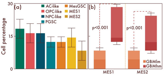 Cell-population profiling in glioblastomas with the presence of classical pathohistological diagnostic criteria. (a) Ratio of the quantitative content of astrocyte-like cells (AC-likes), oligodendrocyte-progenitor-like cells (OPC-likes), neural progenitor-like cell (NPC-like) populations, mesenchymal-like cell population (MES-like) with MES1 and MES2 subpopulations, proneuronal glioma stem cells (PGSCs), and mesenchymal glioma stem cells (MesGSCs) as a percentage of the total tumor cell mass. The ratio (b) of the quantitative content of MES1 and MES2 cell populations in glioblastomas with the presence of classical pathohistological diagnostic criteria and glioblastomas with increasing proliferative activity and Ki-67 LI 5—10% was shown.