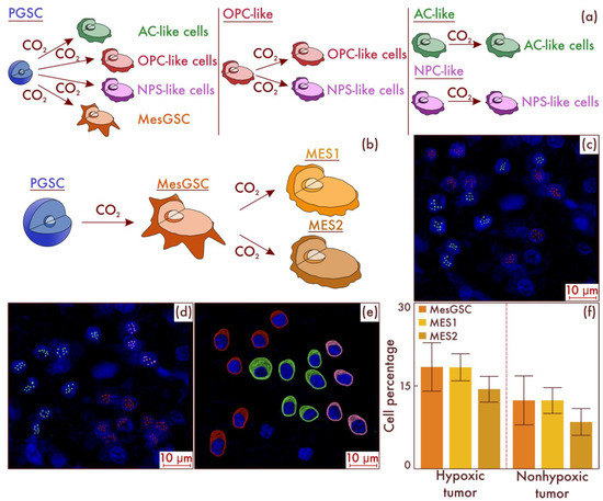Fate tracing of different glioblastoma cell populations in a hypoxic environment (a). Histogenetic transformation pathways of proneuronal glioma stem cell (PGSC), astrocyte-like cell (AC-like), oligodendrocyte-progenitor-like cell (OPC-like), and neural progenitor-like cell (NPC-like) populations are presented. In addition, (b) a further path of evolution under hypoxic conditions of mesenchymal glioma stem cells (MesGSCs) derived from PGSC with the formation of definitive mesenchymal populations was demonstrated. The results were confirmed in glioblastoma (c,d) patient samples, using multiparametric fluorescence in situ hybridization and immunofluorescence (e), on which lime marks correspond to CD133, dark red marks to CD109, and pink marks to DDIT3. The results of a comparative study (f) of the mesenchymal-cell-population composition of glioblastomas with and without the HIF-1α hypoxia marker increase are presented in the material of patients’ neoplasms.