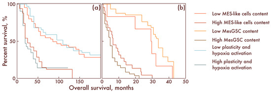 Kaplan–Meier curves demonstrating overall survival of patients with low and high MES-like cells and low and high activation programs of plasticity and cell response to hypoxia in diffuse gliomas, IDH-mut (a), as well as with low and a high content of MES-like cells and MesGSC in glioblastomas (b). The overall survival is shown along the abscissa in months; along the ordinate axis, the percent survival is shown.
