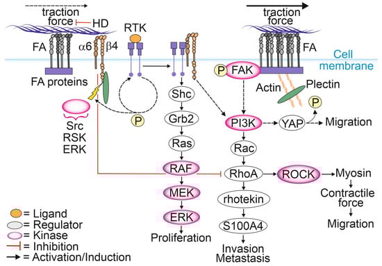 Although FAs and HDs are distinct complexes, they seem to dynamically regulate each other via intricate signaling crosstalk that is not yet thoroughly understood [11,12,13]. Several reports find that loss of HDs promotes cell migration by stimulating FA dynamics [11,78,79]. Microscopic analysis of exogenous and endogenous FA marker proteins showed higher FA dynamics and faster diffusion rates for FA-localized vinculin in and out of FAs in HD-depleted PCa cells. Moreover, several FA marker proteins formed larger FAs compared to cells with intact HDs [11]. Furthermore, upon HD disassembly plectin relocated to actin filaments with a concomitant increase in stress fiber formation, focal adhesion kinase (FAK) autophosphorylation and activation of the PI3K/AKT pathway. Another study reported upregulation and activation of FAs leading to increased actomyosin contractility and traction forces stimulating FAK phosphorylation and translocation of Yes-associated protein (YAP) into the nucleus [78,80]. Active YAP subsequently activates the Rho/ROCK/myosin light chain (MLC)-pathway at the transcriptional level, whereas FAK activates multiple signaling pathways promoting cell migration [78,81,82,83,84,85,86,87]. Furthermore, downstream of the PI3K/Rac/RhoA pathway, rhotekin plays an important role by interacting with S100 calcium-binding protein A4 (S100A4) to promote membrane ruffling, lamella formation and the generation of contractile forces facilitating tumor invasion [88,89,90]. Taken together, HD-mediated adhesion to laminin is essential for the suppression of FA maturation and cell spreading, possibly through a reduction in RhoA/ROCK/MLC signaling [78]. Therefore, RhoA remains inactive, contributing to low ROCK activity, thereby preventing myosin phosphorylation, and ultimately leading to a decrease in actomyosin contractility and traction forces [82].