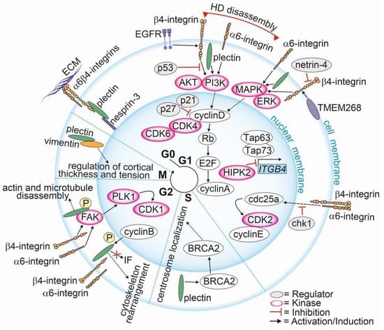 The involvement of HD components in cell cycle regulation has been documented (Figure 3). However, there are only a few papers specifically focusing on the involvement of α6β4-integrins and plectin in the regulation of cell cycle in PCa. Here, we compile these studies and correlate them with evidence for the role of HD components in the cell cycle in other cancer types.