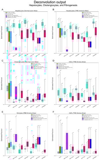 These two cell types constitute the major functional units of livers—liver lobule and bile ducts []. As both the Normal Liver and TME-Immune atlases have hepatocytes, we made a comparison of results by deconvolution with two different atlases for the same dataset. Figure 2A,B show the results of deconvolution for the same datasets with different atlases. Compared with the results determined with the TME-immune atlas, deconvolution with the normal atlas returned higher levels of hepatocytes for some datasets (such as GSE119336) and lower levels for others (such as GSE94660). However, both experiments arrived at the same result whereby the decrease of hepatocytes and elevation of cholangiocytes are common in liver cancer. Similarly, File S3, pages 1–3 generated by deconvolution with TME-Stroma resulted in the same conclusion. Compared with HCC, the decrease of hepatocytes in CCA is more significant (Figure 2A,B).