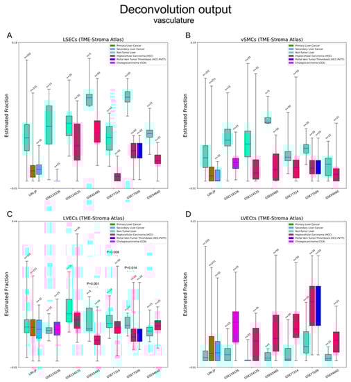 Deconvolution output—vasculature. (A–D) Estimation of liver sinusoidal endothelial cells (LSECs), vascular smooth muscle cells (vSMCs), liver vascular endothelial cells (LVECs), and tumour LVECs (LVECts). These four cell types/subtypes are key components of blood vessels in both normal and cancerous livers. Decreases of normal structural blocks (LSECs, vSMCs) and abnormal angiogenesis (LVECts) can be seen in liver cancers. Not all the differences are statistically significant. Pairs with p < 0.05 have been labelled.