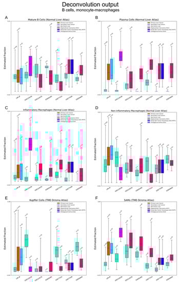 Deconvolution output—B cells, monocyte–macrophages. (A,B) Estimation of B cells. Plasma B cells can rarely be detected in normal livers but common in liver cancers. (C–F) Estimation of macrophages. The Normal Liver atlas separates macrophages into inflammatory and non-inflammatory subtypes. The TME-Stroma atlas identified Kupffer cells, scar-associated macrophages (SAMs) and tissue macrophages (TMs, Figure 6E). Overlap of cell type trees may exist between the two atlases. Increase of inflammatory macrophages can be seen in liver cancers. SAMs are a pathological variant of macrophages and participate in the process of liver fibrosis. Their elevation can be seen in liver cancers.